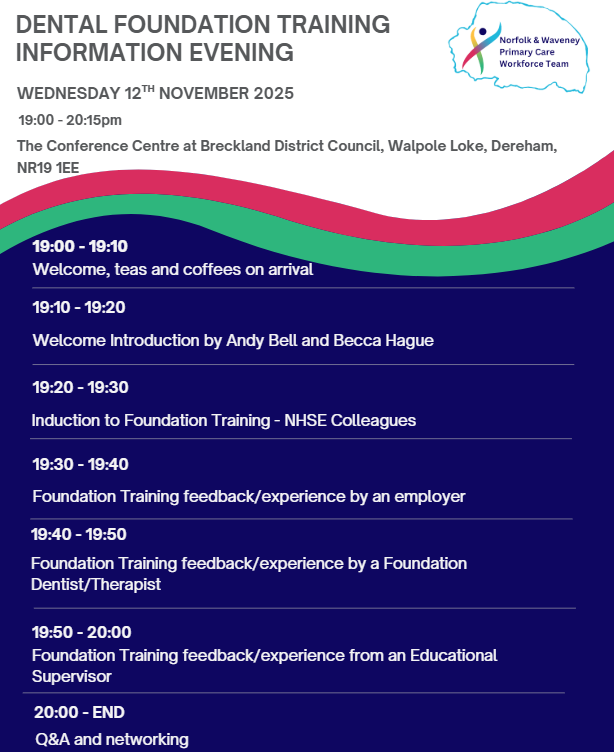 How to Register: Click this link to register - Dental Foundation Training Information Evening Further date to follow. Any questions, please contact: 📧 Becca Hague – becca.hague@nhs.net 📞 01603 508715 Best wishes, Becca Hague Primary Care Workforce Senior Officer NHS Norfolk and Waveney Integrated Care Board (ICB) Norfolk & Waveney Integrated Care System (ICS) Email: becca.hague@nhs.net Website: https://improvinglivesnw.org.uk/ Phone: 01603 508715